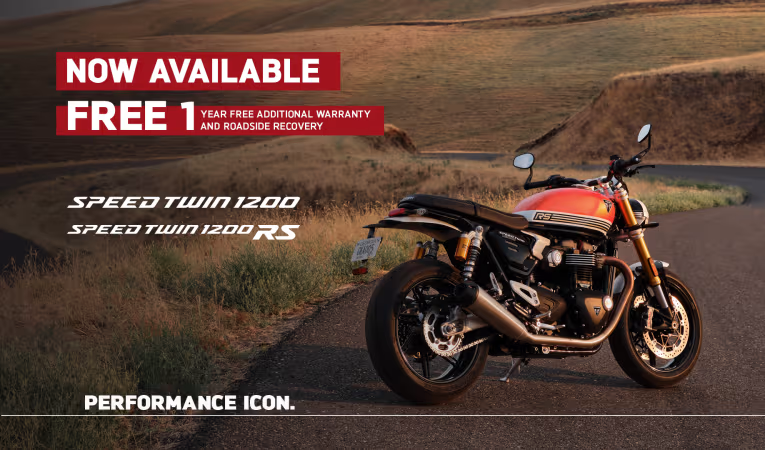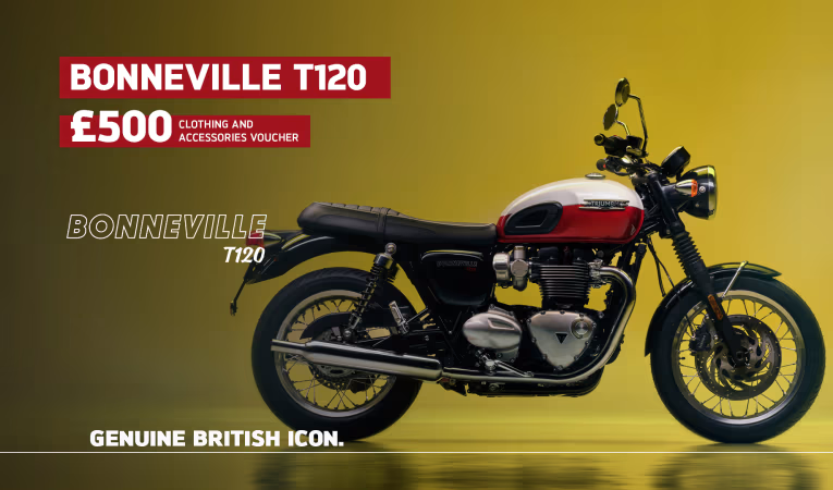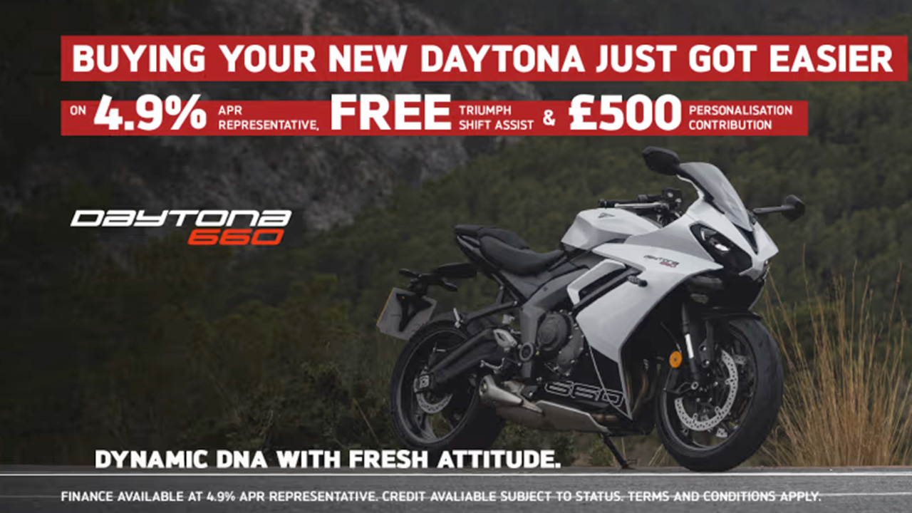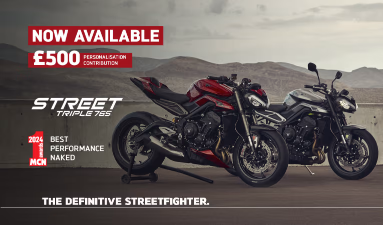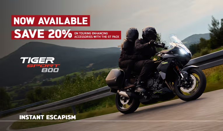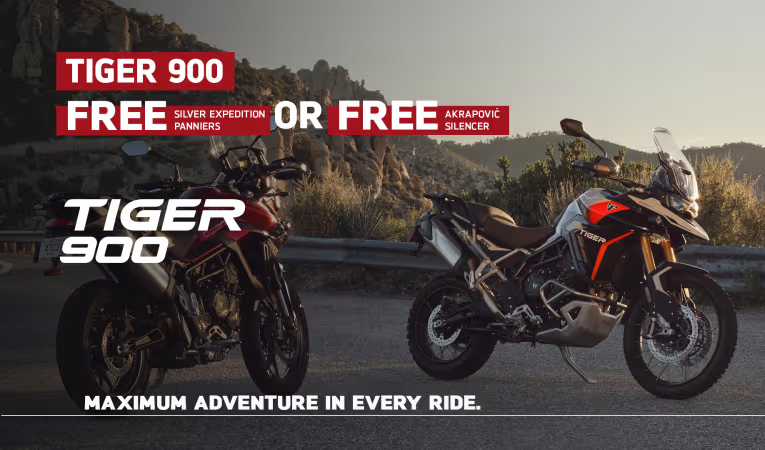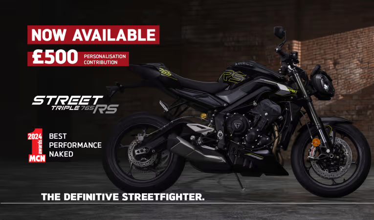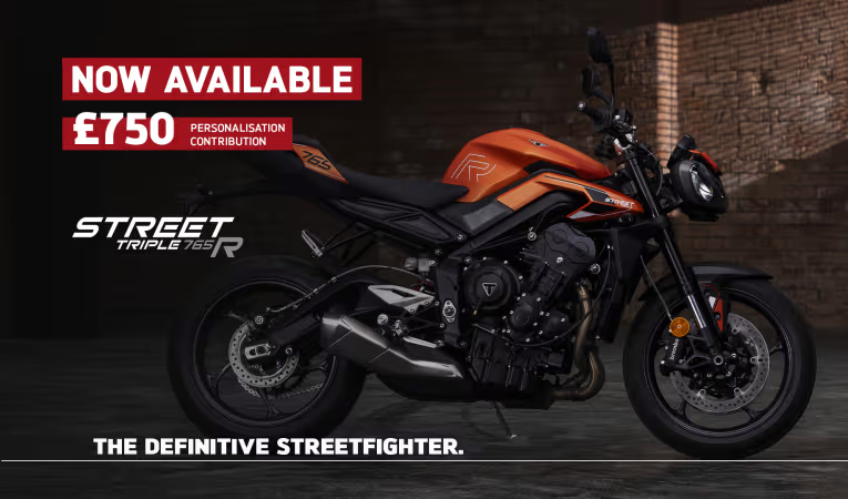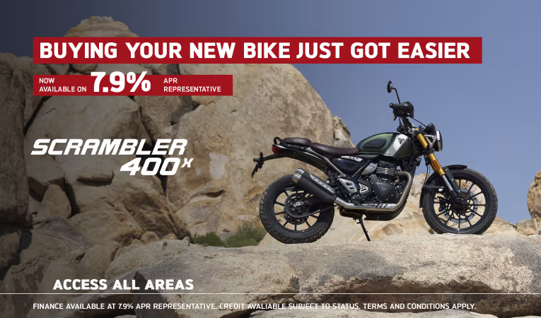 Credit is subject to status and is only available to UK residents aged 18 +. Only available through Triumph TriStar, a trading style of Black Horse Ltd, St William House, Tresillian Terrace, Cardiff CF10 5BH. With TriStar Personal Contract Purchase (PCP) you have the option after you have paid all of the regular monthly repayments to: (1) Return the motorcycle and not pay the Optional Final Repayment. In this example if the motorcycle has exceeded 12,333 miles, a charge of 7.2p (including VAT at 20%) will apply per excess mile. If the motorcycle is in good condition (fair wear and tear accepted) and has not exceeded 12,333 miles you will have nothing further to pay. (2) Pay the Optional Final Repayment to own the motorcycle or (3) Part exchange the motorcycle subject to settlement of your existing finance agreement; new finance agreements are subject to status. (4) Offer ends: 30.09.2024. Figures are correct at the time of print and may be subject to change.